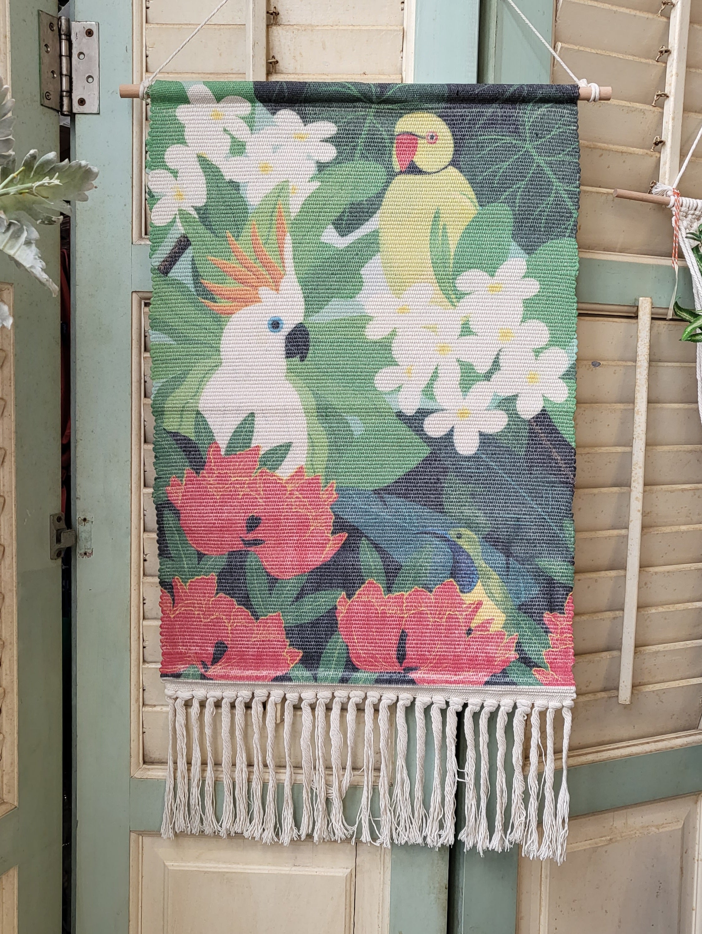 The tropical birds print on hand-woven cotton tapestry is the perfect decoration for your home!