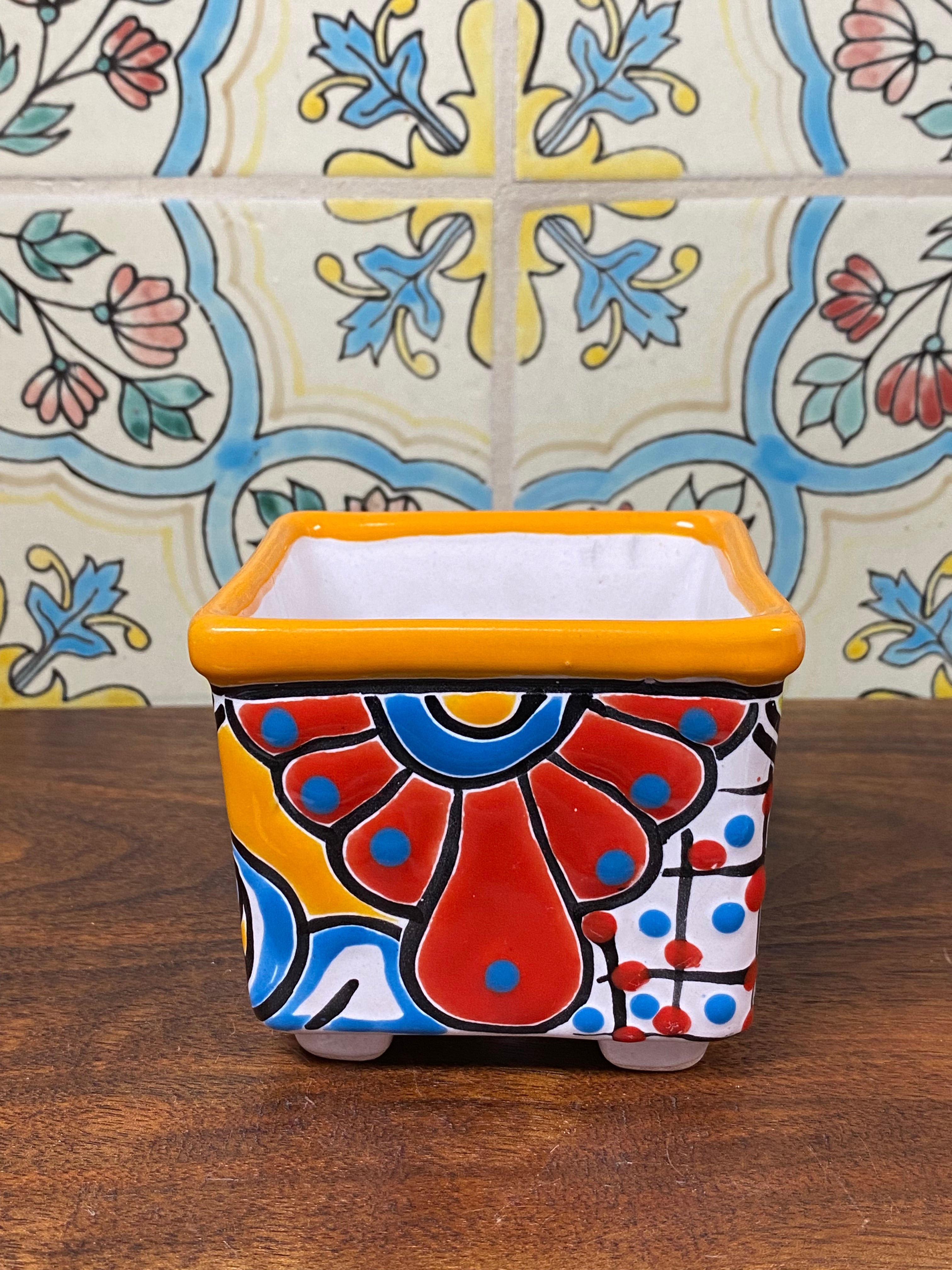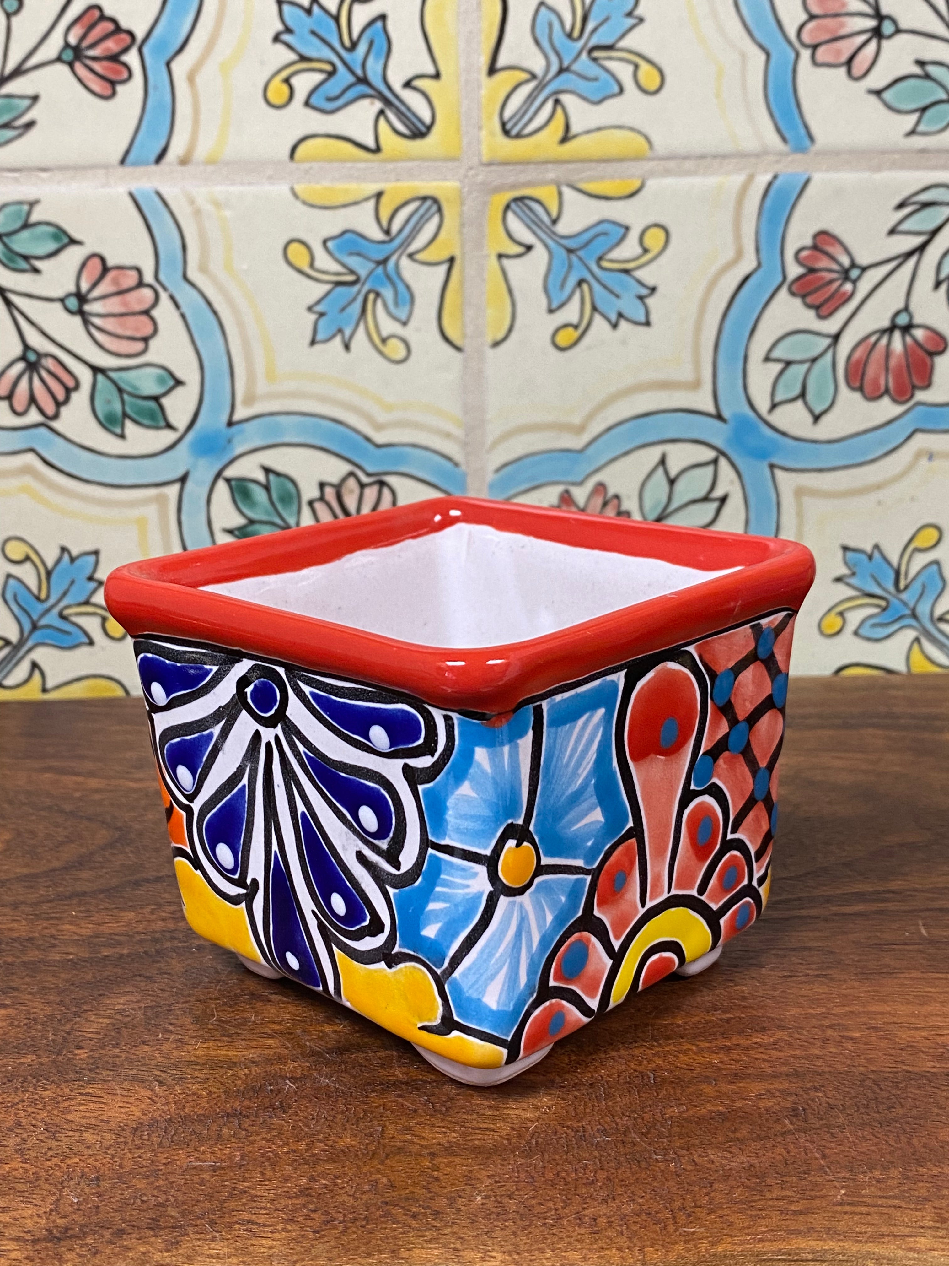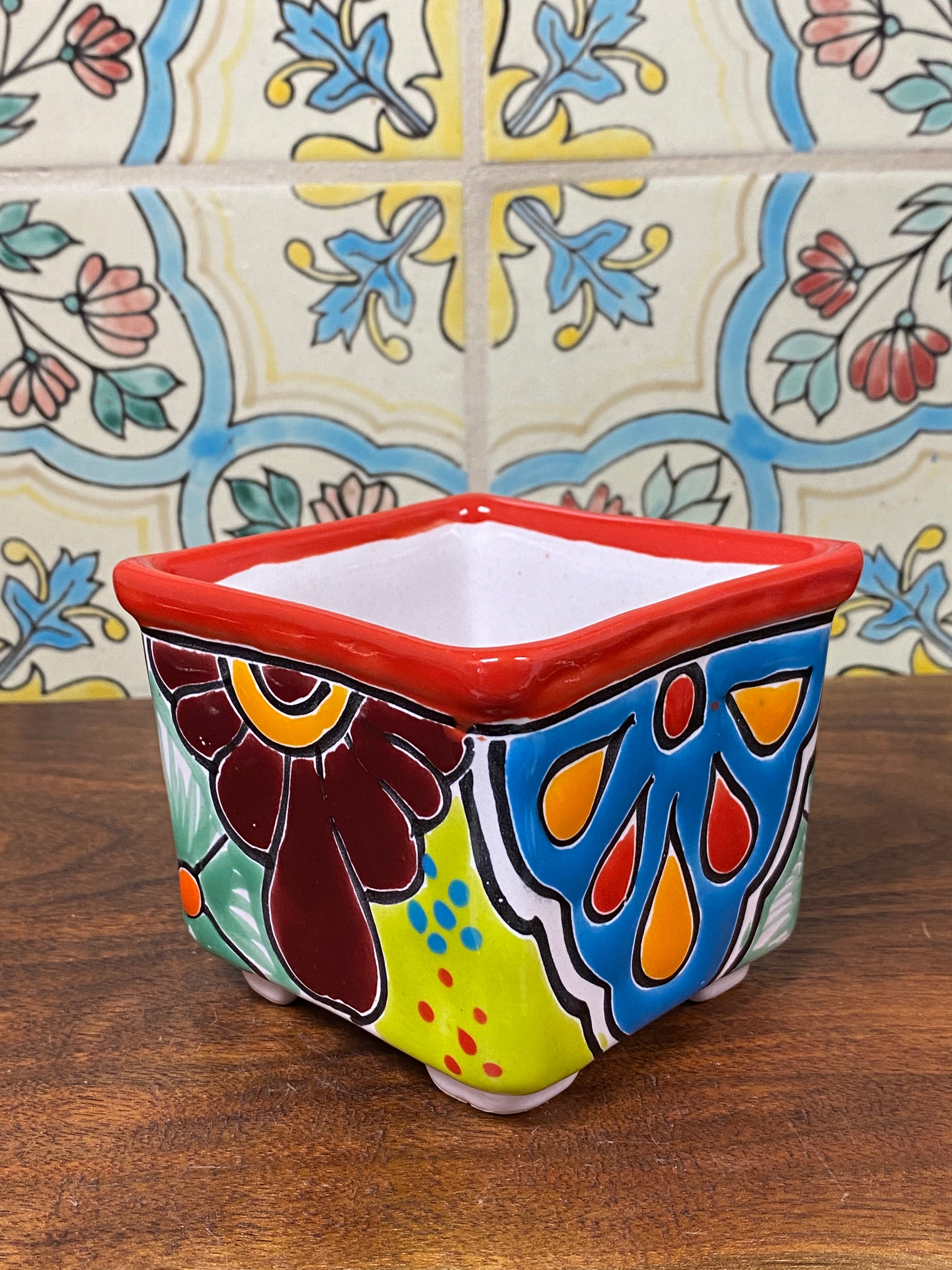 different design options available. Hand painted small Talavera planter with drain hole. Perfect for small succulents