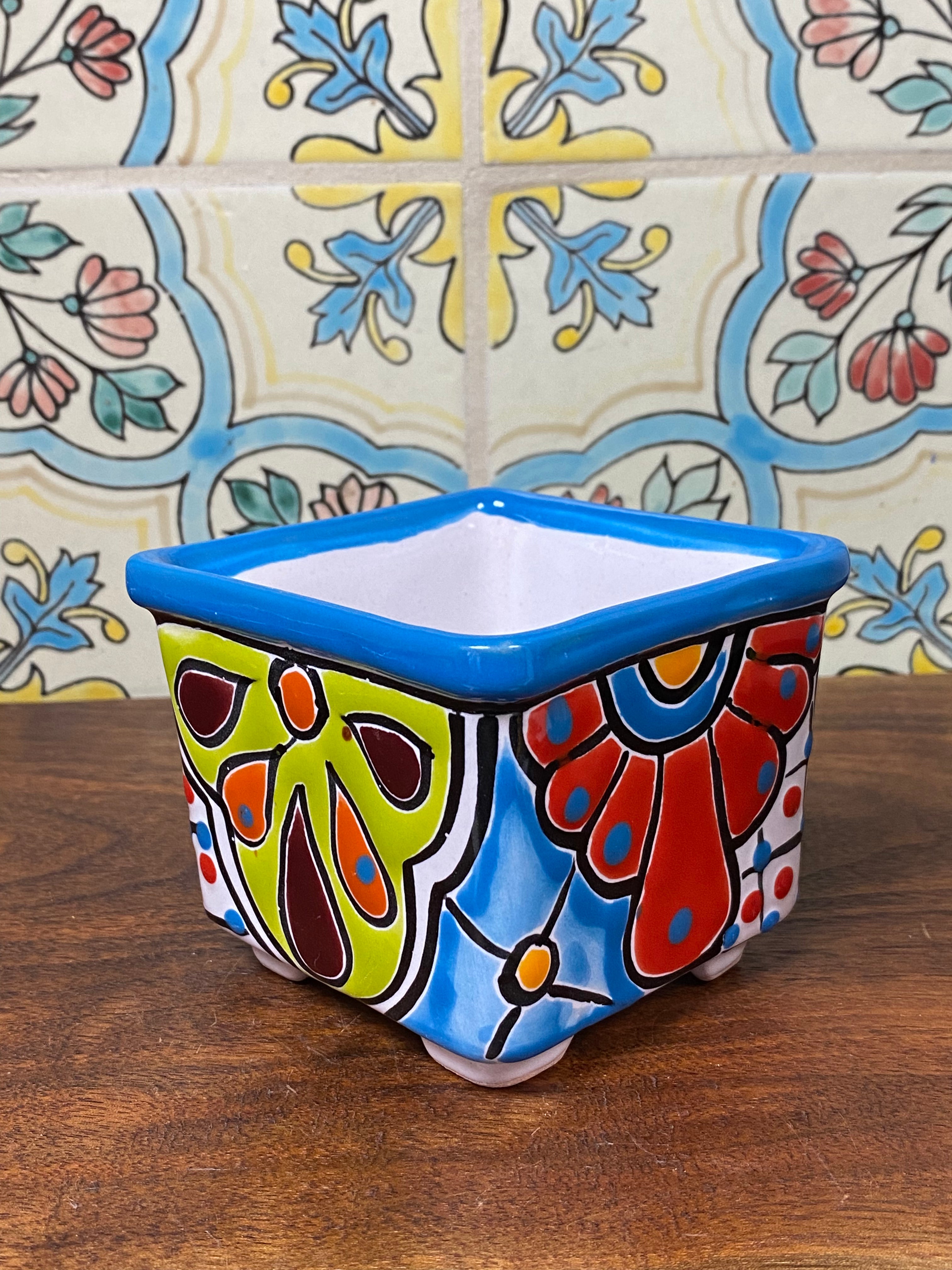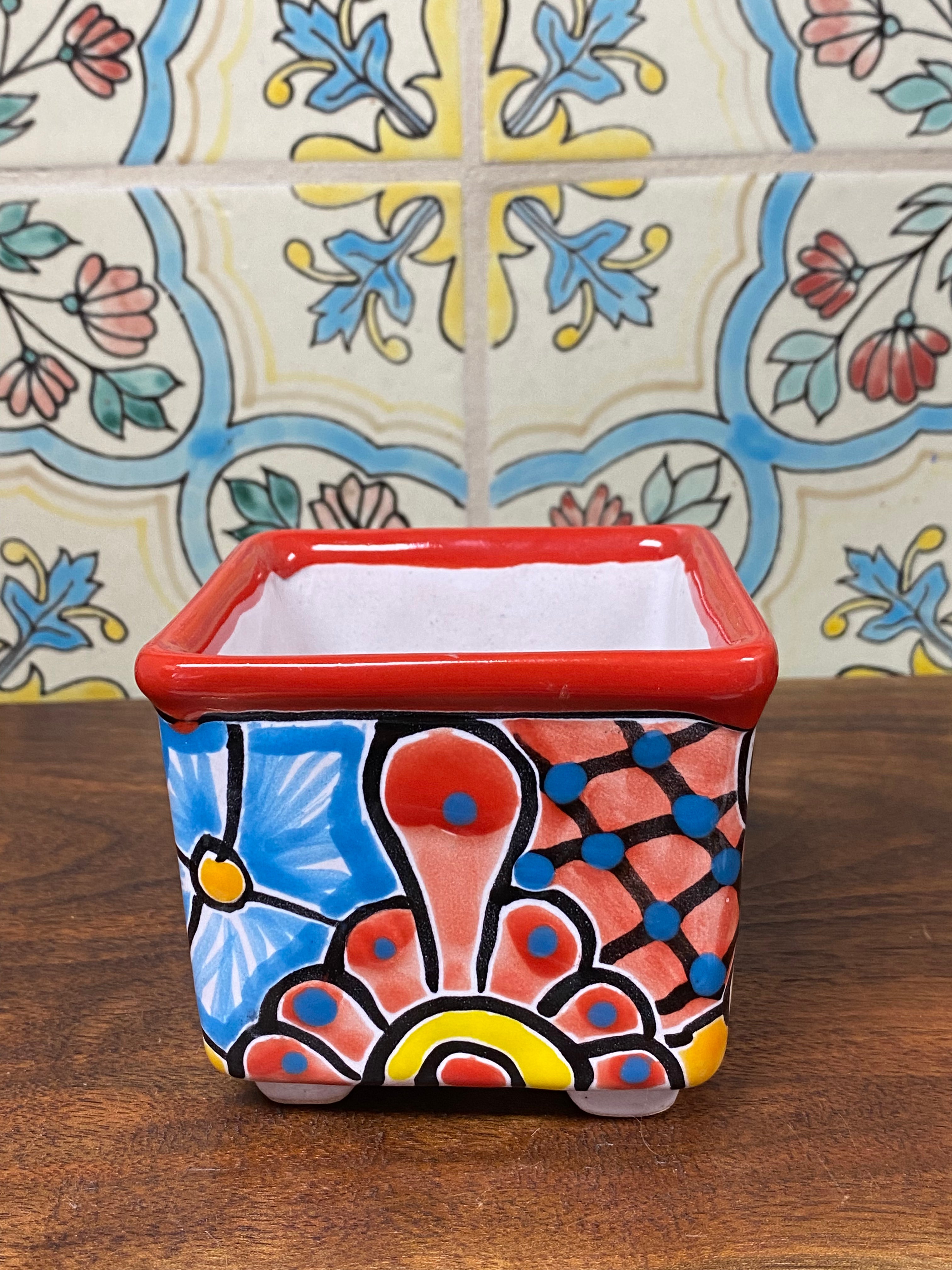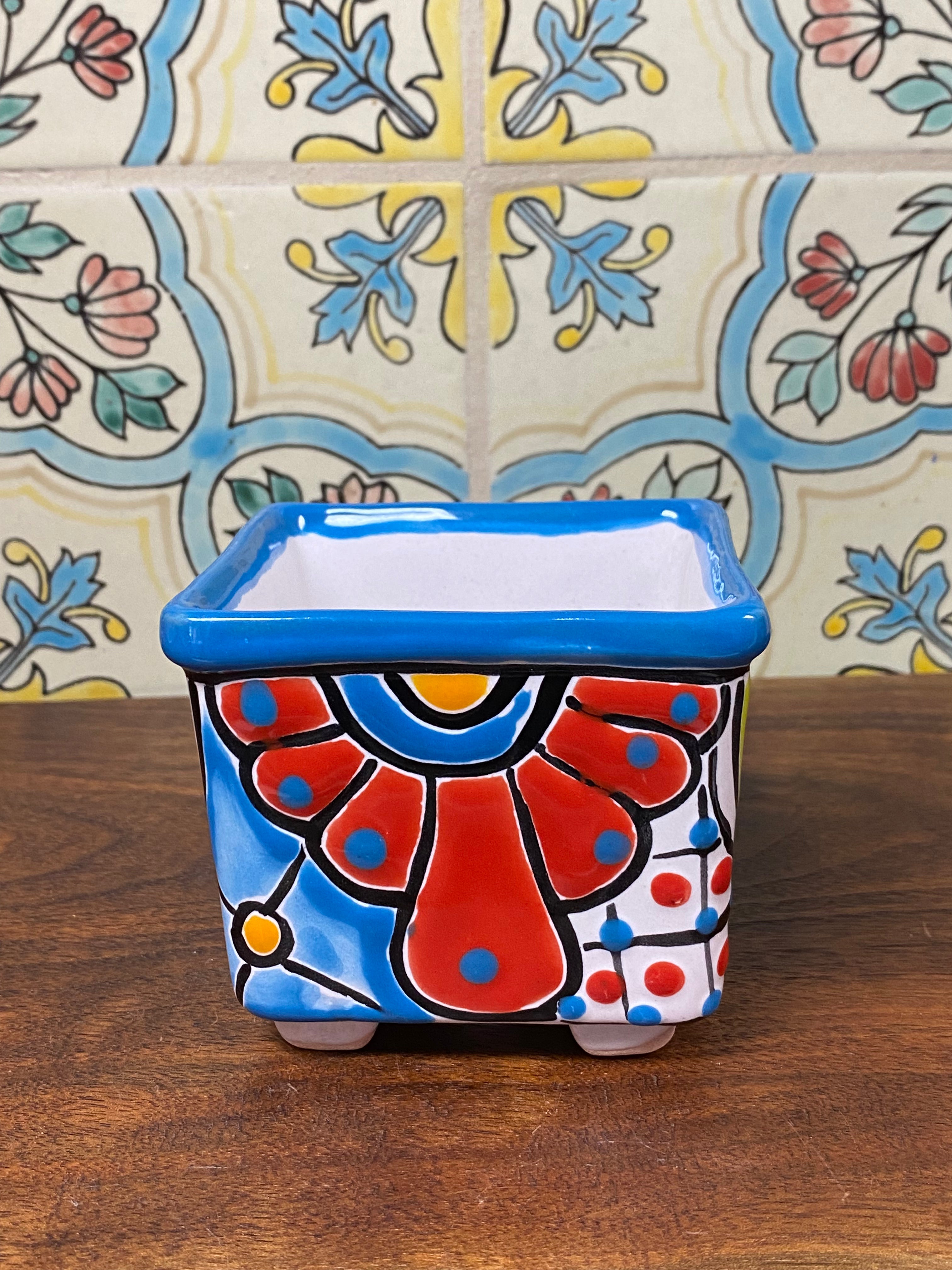 different design options available. Hand painted small Talavera planter with drain hole. Perfect for small succulents