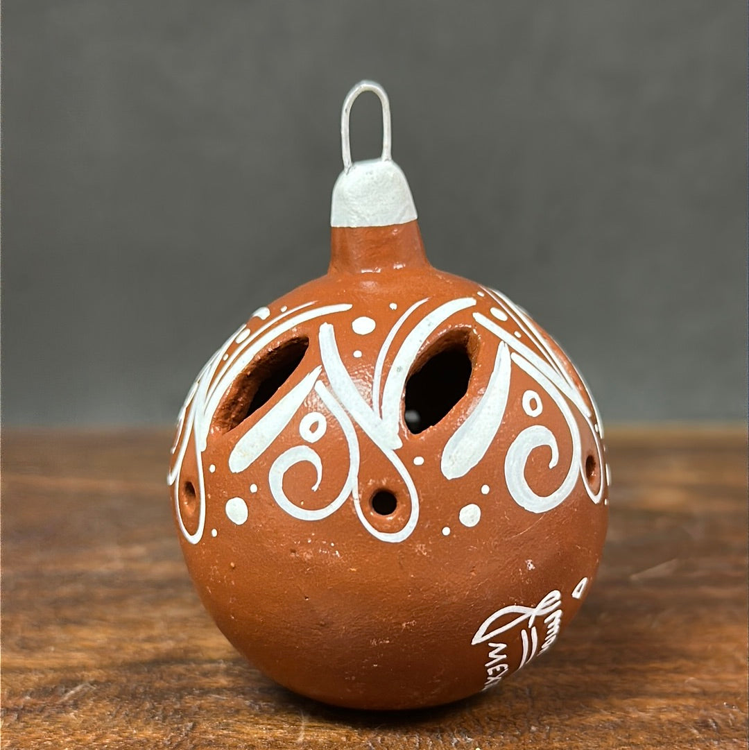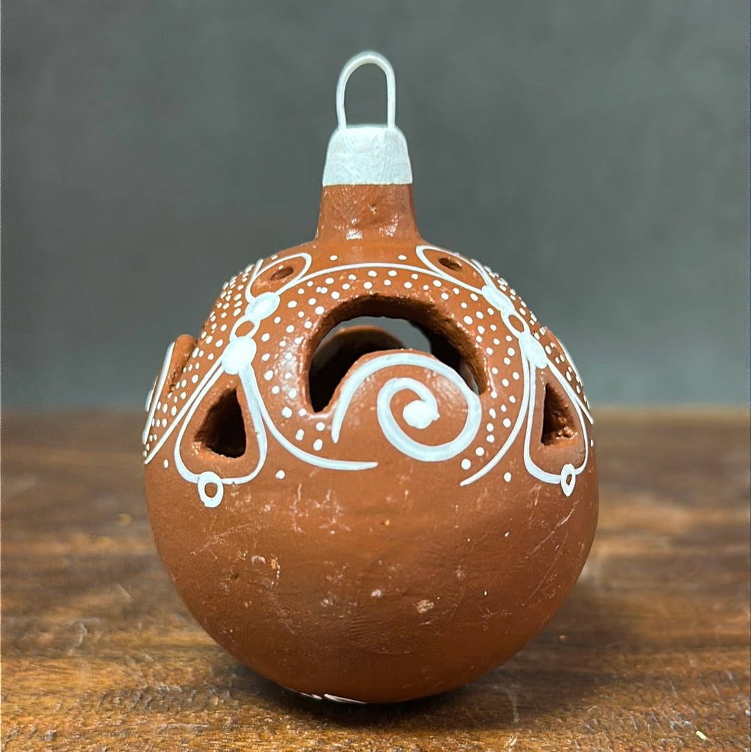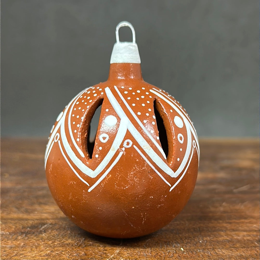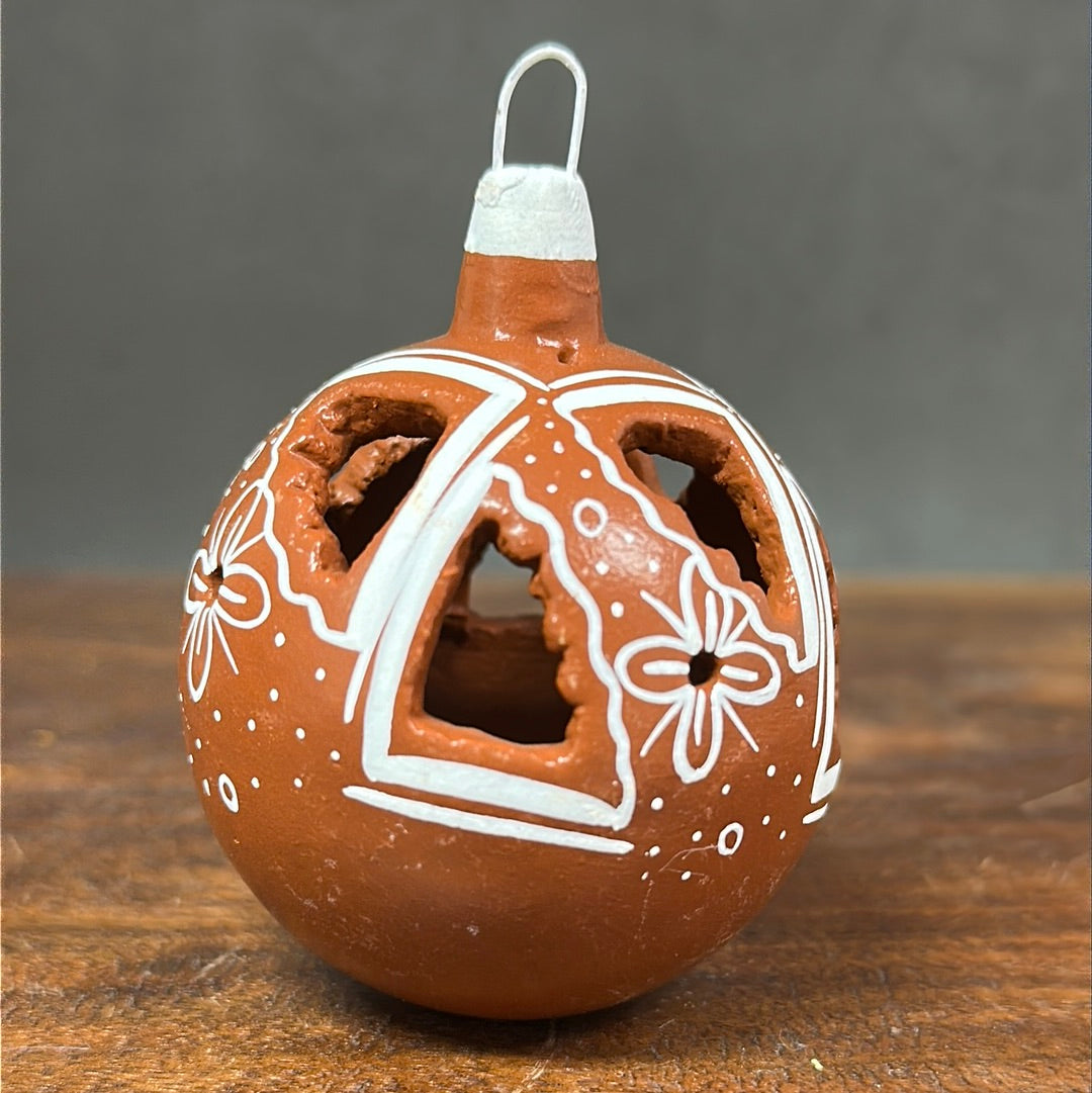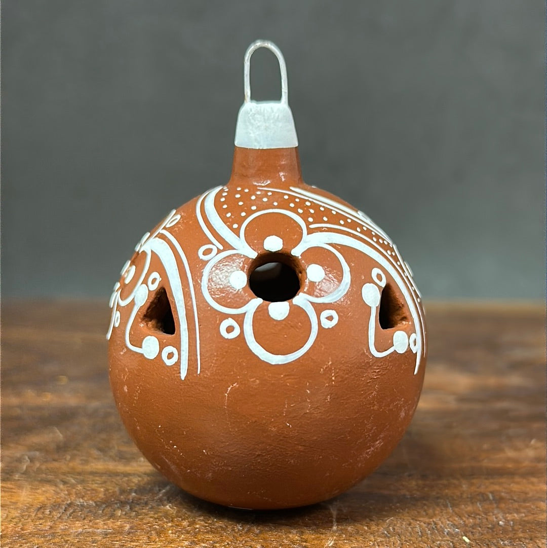 Hand painted clay sphere ornament with carved details