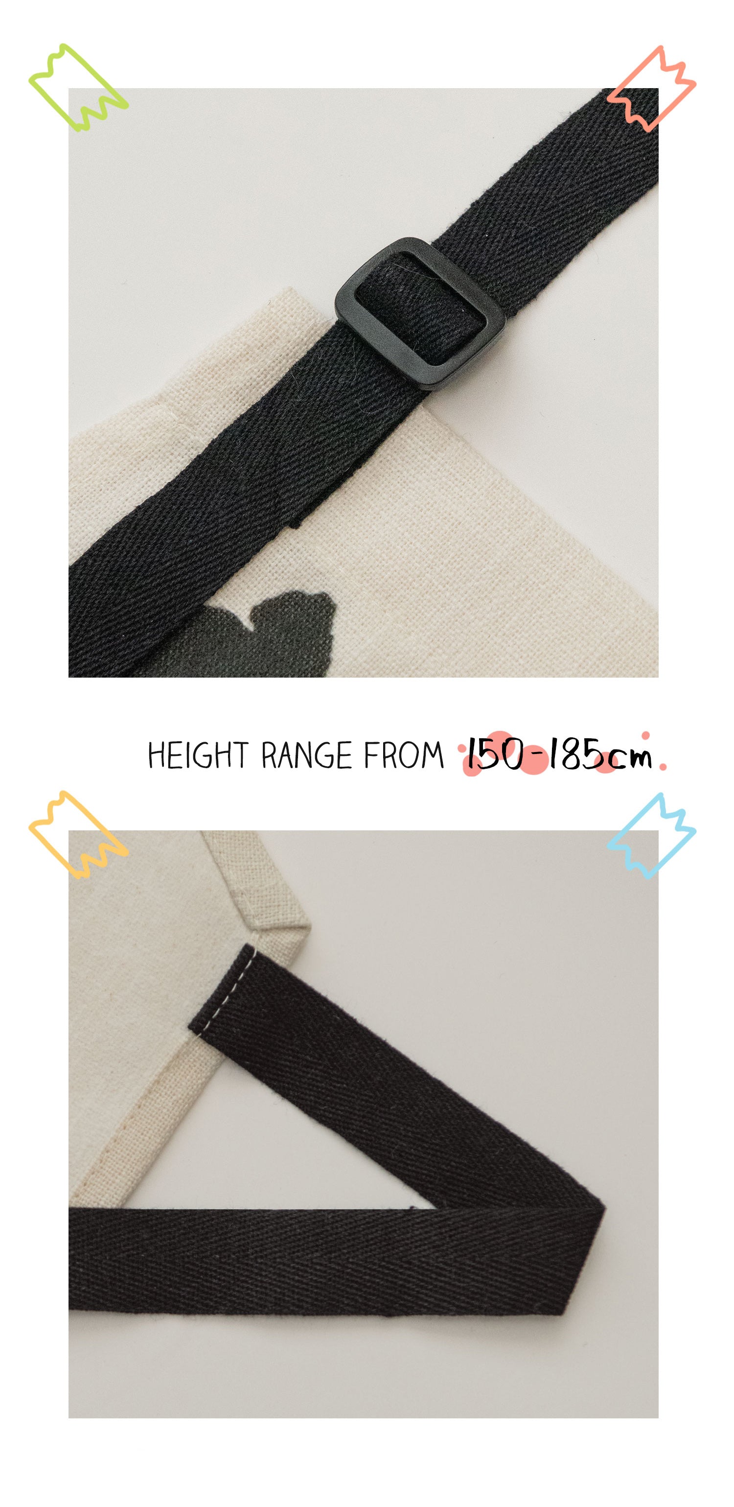All aprons have an adjustable neck strap, long waist strap (making it easy to tie), suitable for people height from 150cm to 185cm,